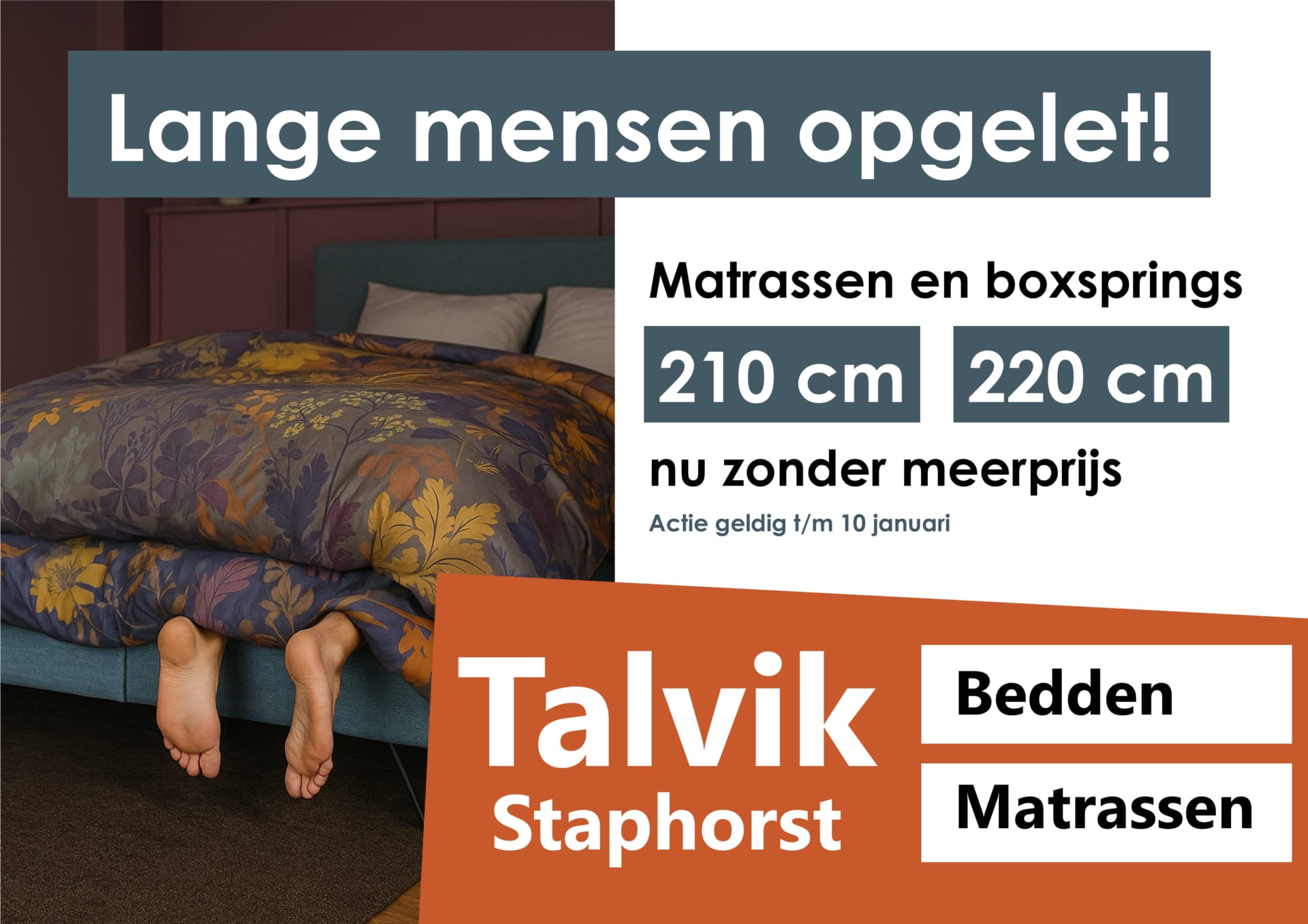 Welkom bij Talvik Bedden, de beddenwinkel in het hart van Staphorst. We hebben een ruime keuze in boxsprings en matrassen, hoofdkussens en dekbedden in het middensegment. Doordat wij onderdeel zijn van de groothandel Alta Meubelen profiteer je bij ons van kwaliteitsproducten tegen een scherpe prijs. In onze showroom van circa 300 m² helpen we je graag. Kom langs bij Talvik!