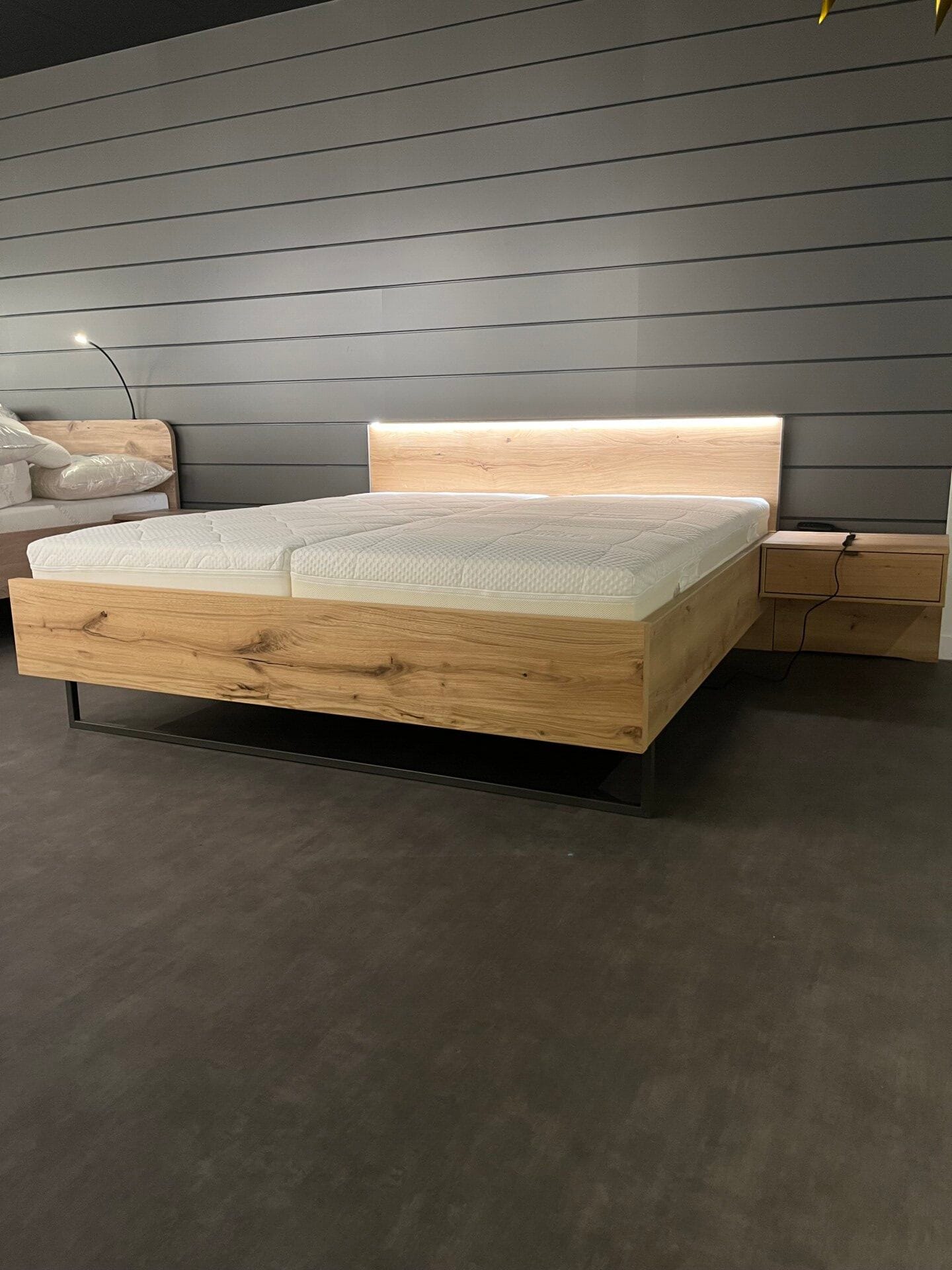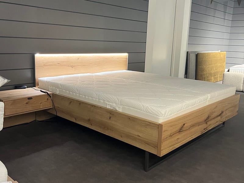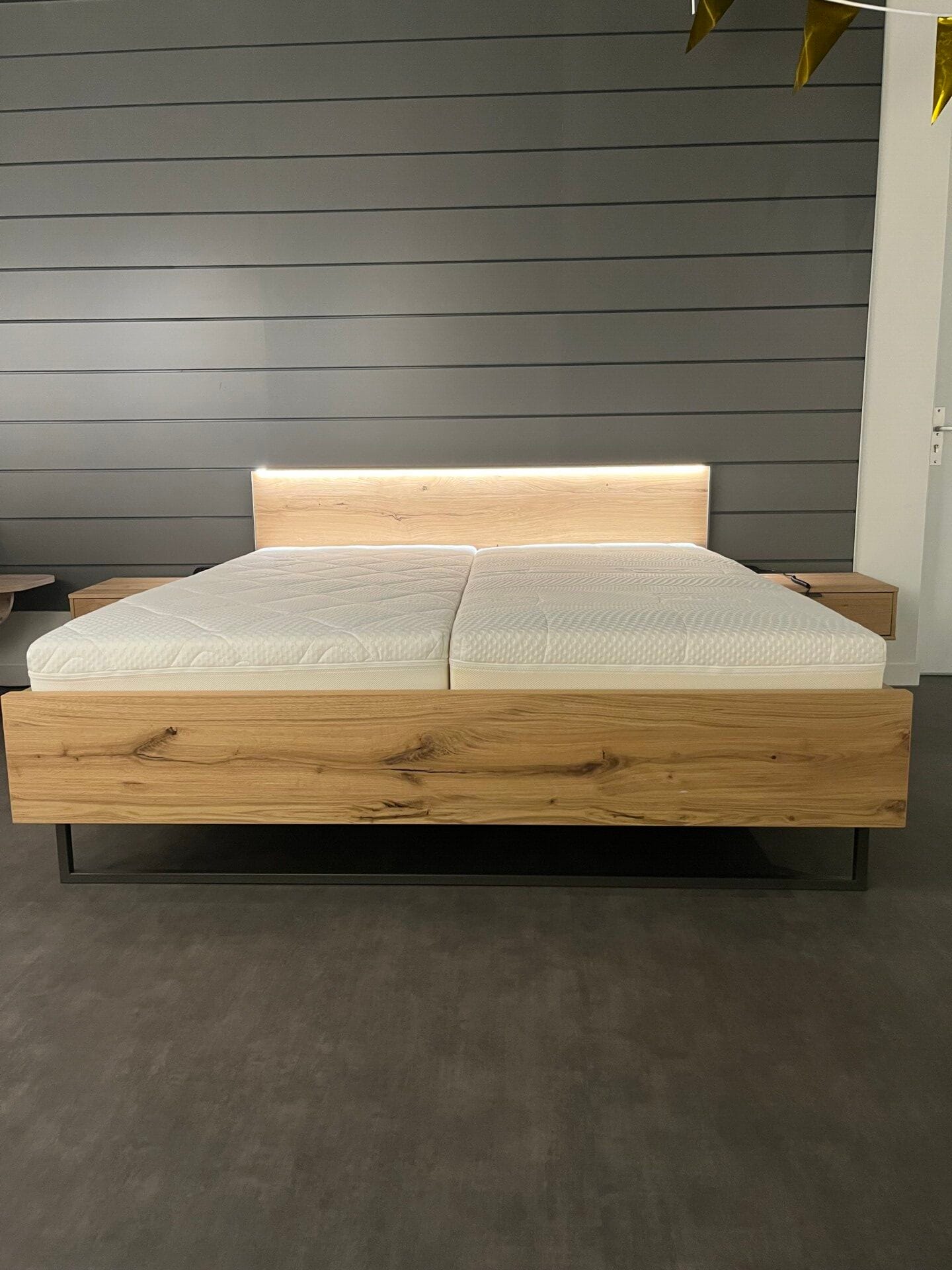 Prachtig complete set met een strak hoofdbord met verlichting. Massief eiken, natuurlijke, warme en authentieke uitstraling.