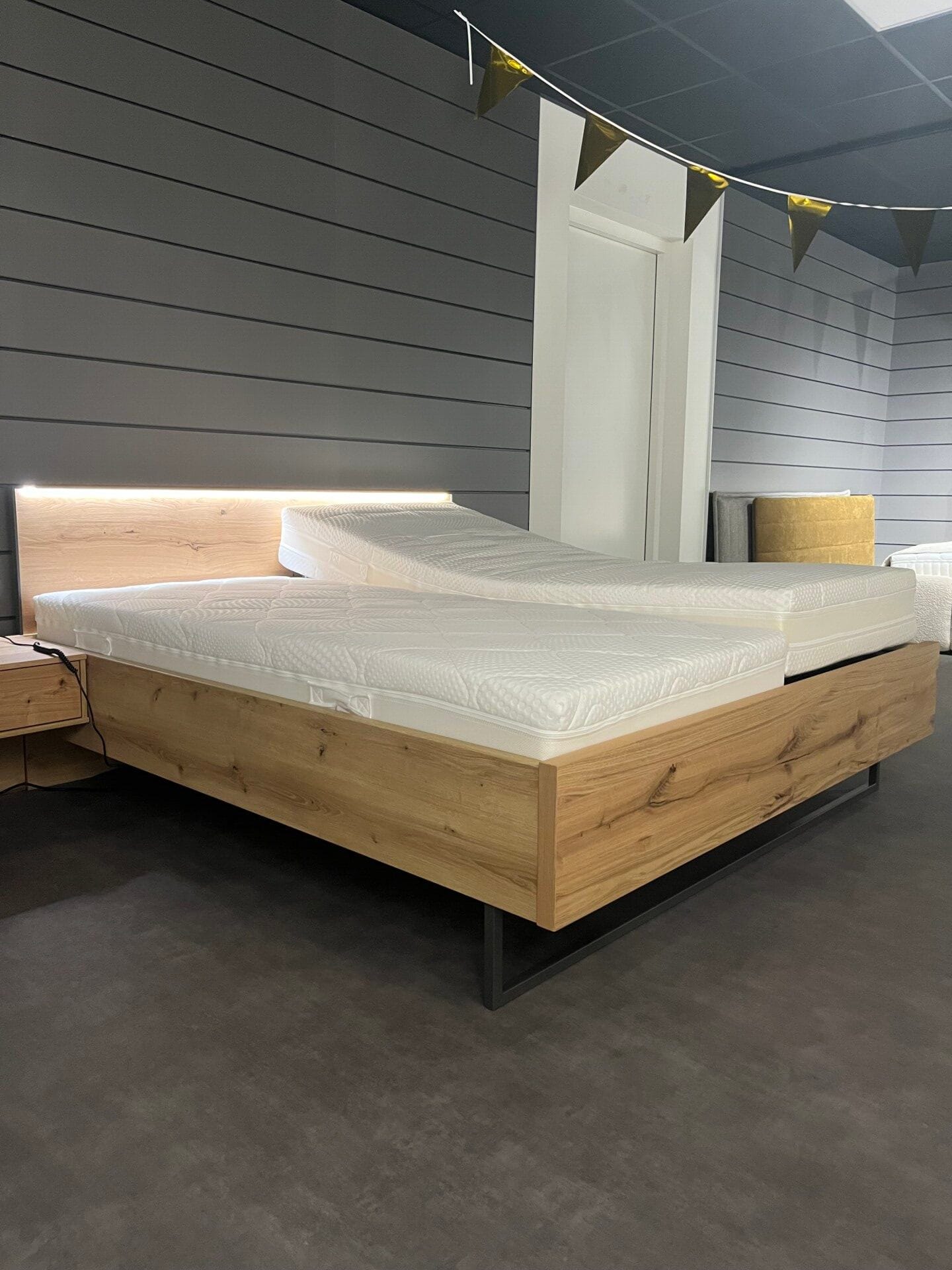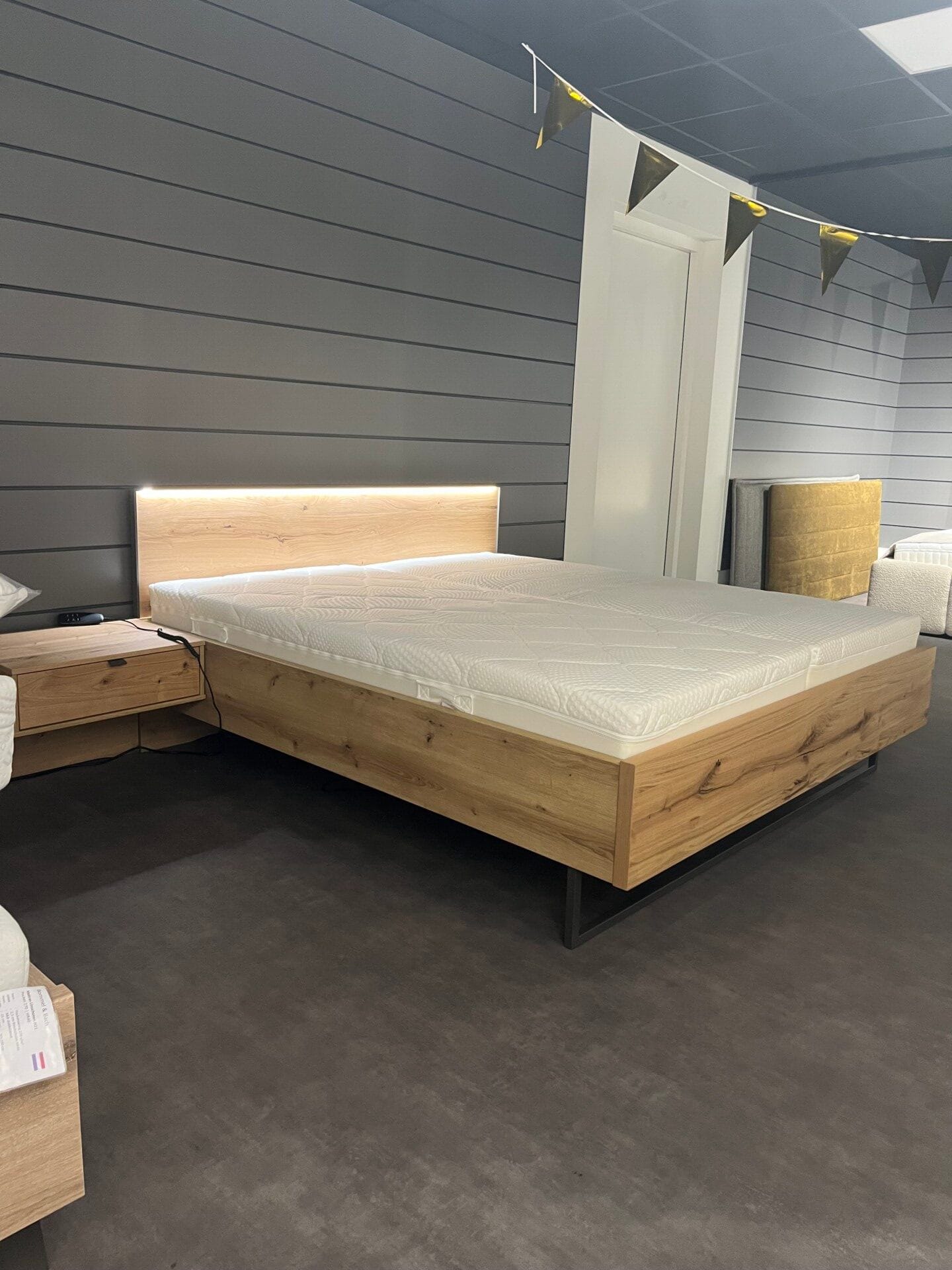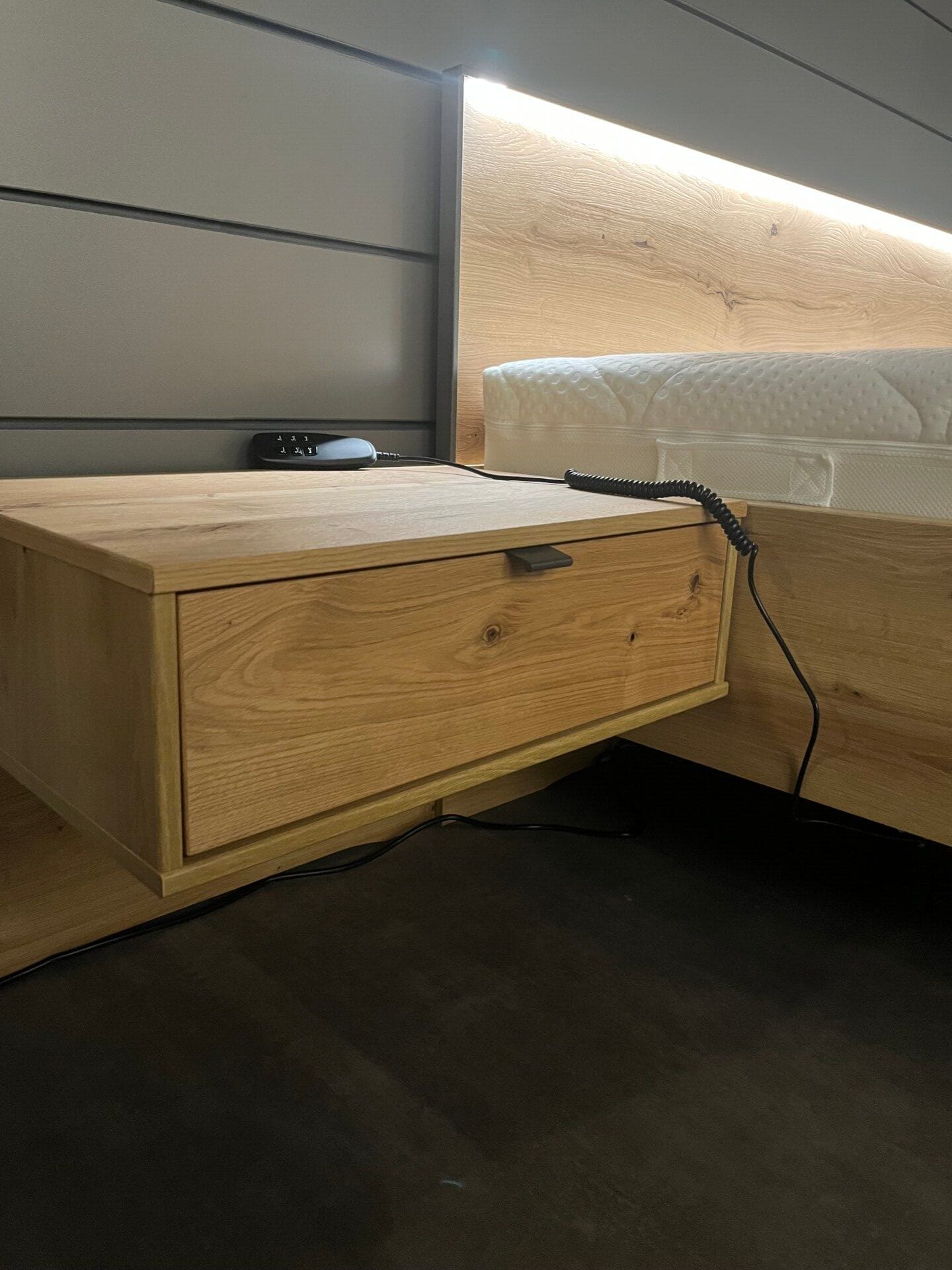 Prachtig complete set met een strak hoofdbord met verlichting. Massief eiken, natuurlijke, warme en authentieke uitstraling.